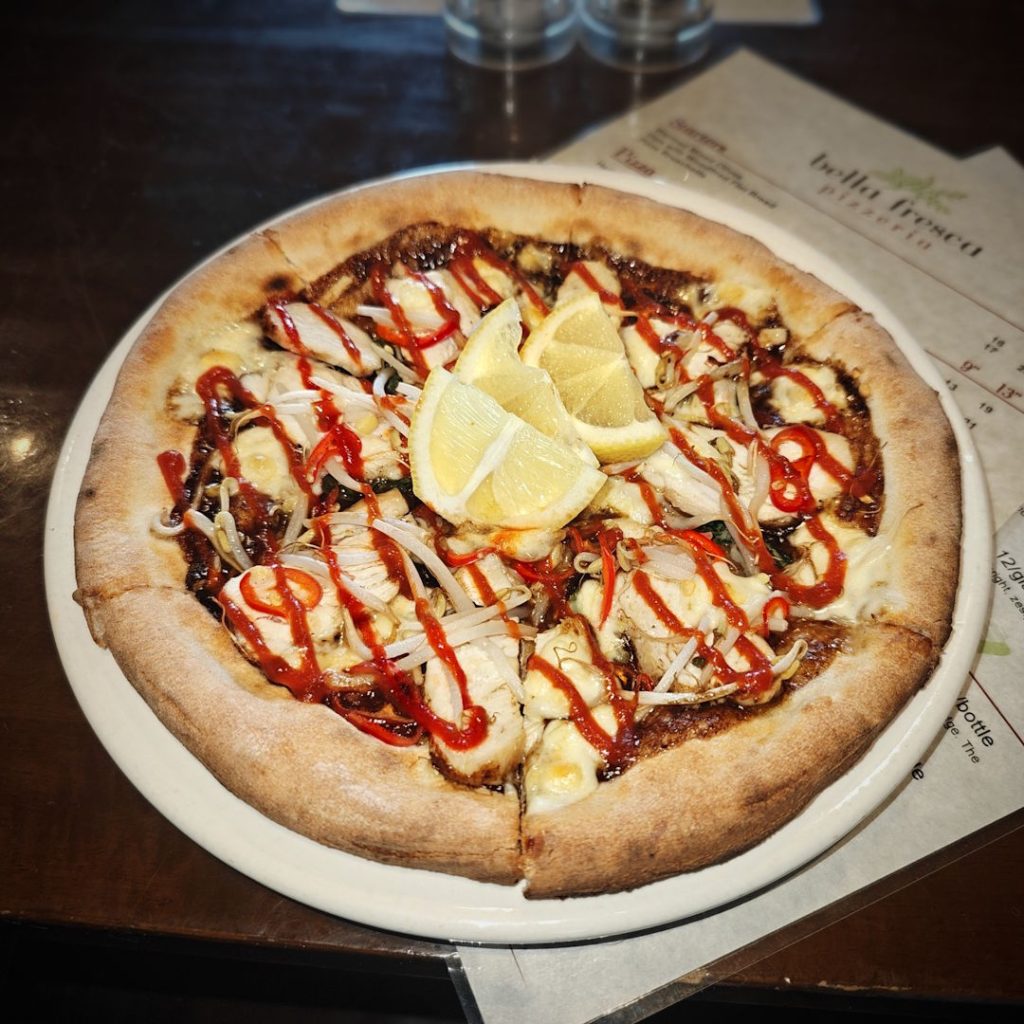 Starting with a Hoisin & Olive Oil base, topped with Chicken Breast, Bean Shoots, Fresh Chilli & Feta then finished with Sriracha & fresh Lemon Wedges!